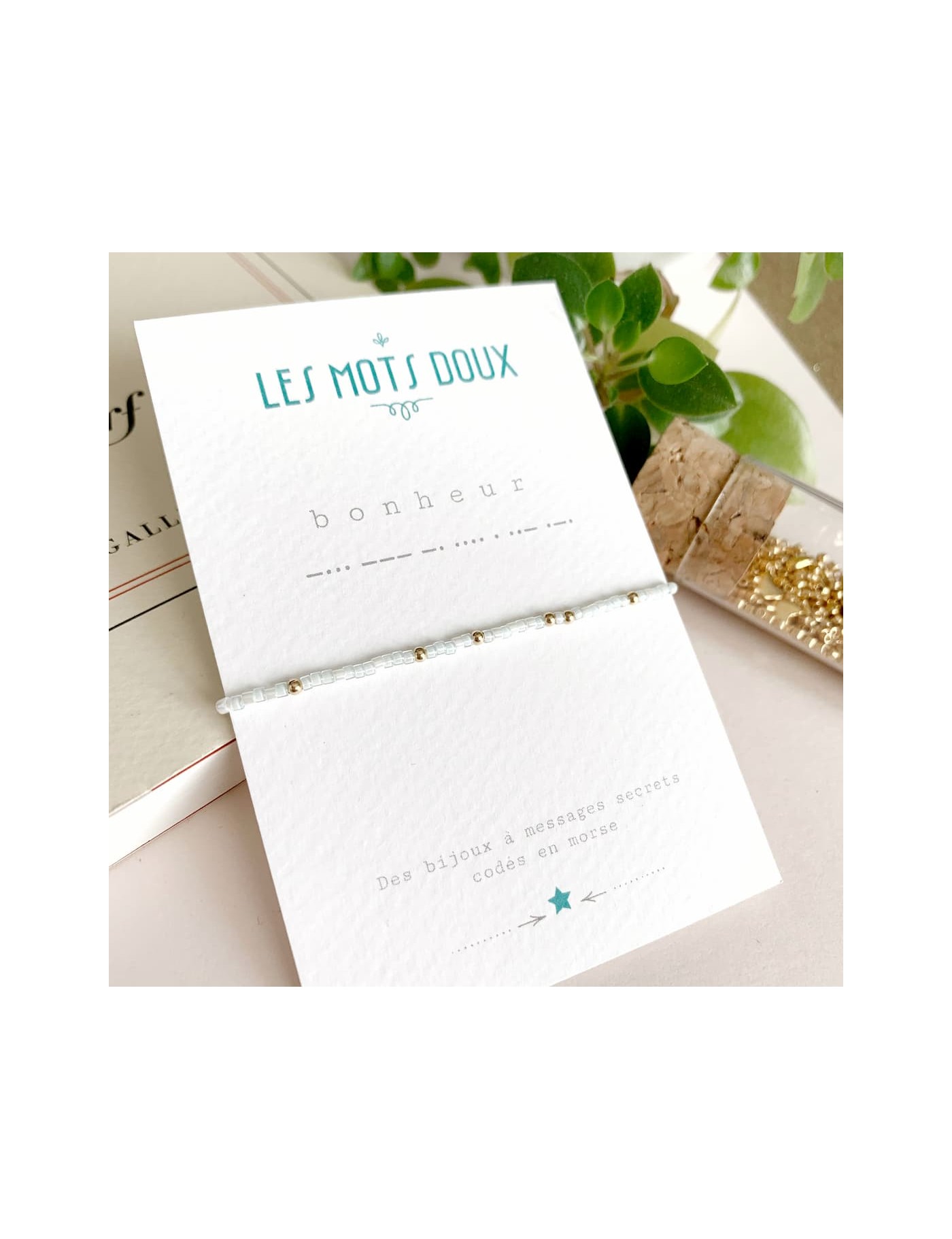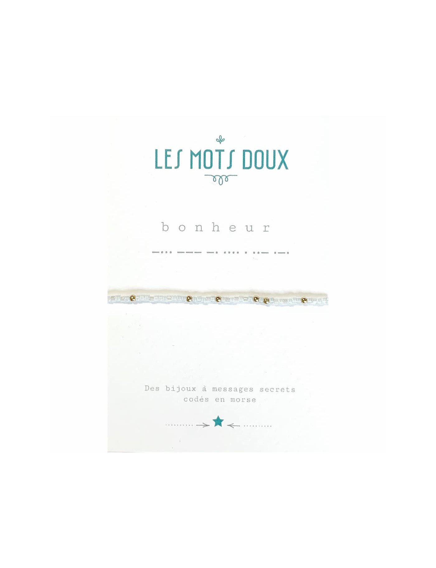 Qui n'a jamais rêvé d'un bracelet à message secret ? Ce bracelet, imaginé par Les Mots doux, contient un message caché : bonheur. Les perles fines reprennent le code de l'alphabet morse. Le bracelet code morse est fabriqué en France, à la main. Les perles sont de couleur dorée, blanche et bleu très pâle.