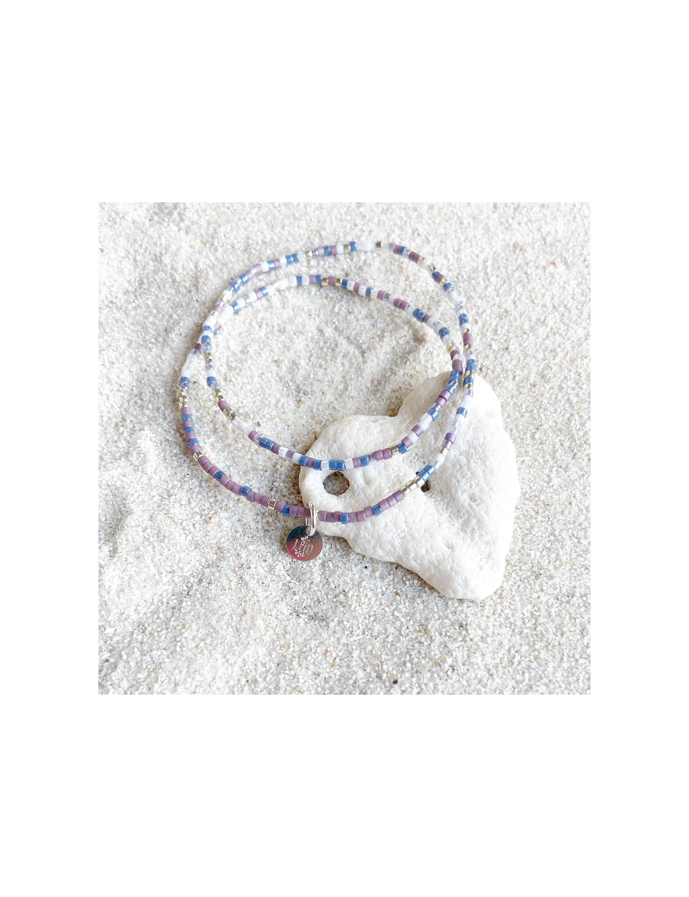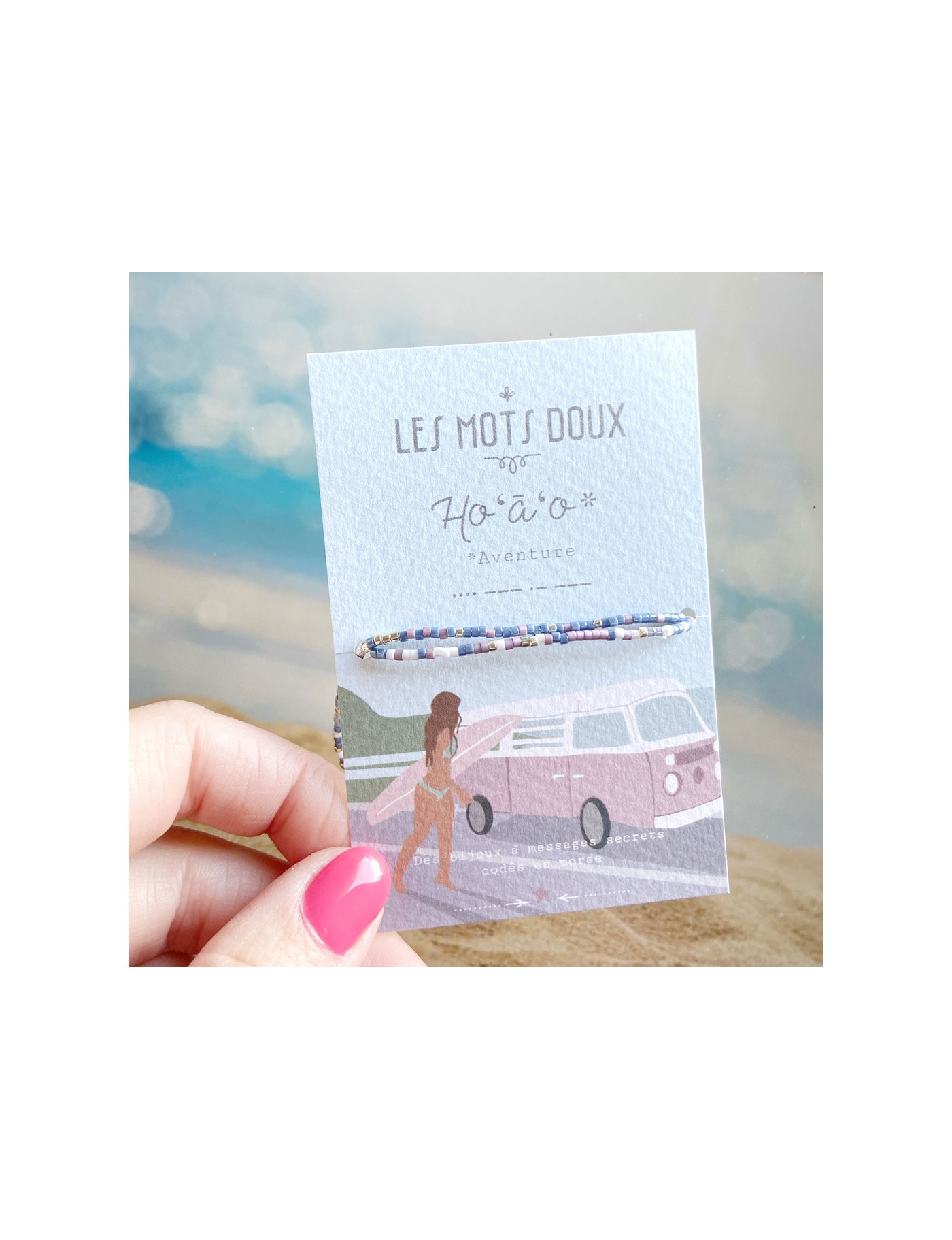 "Hoao" signifie "aventure" en hawaïen. Ce bracelet double tour est fabriqué à partir de perles qui reprennent le code de l'alphabet morse. Chaque bracelet est fabriqué à la main, en France.
