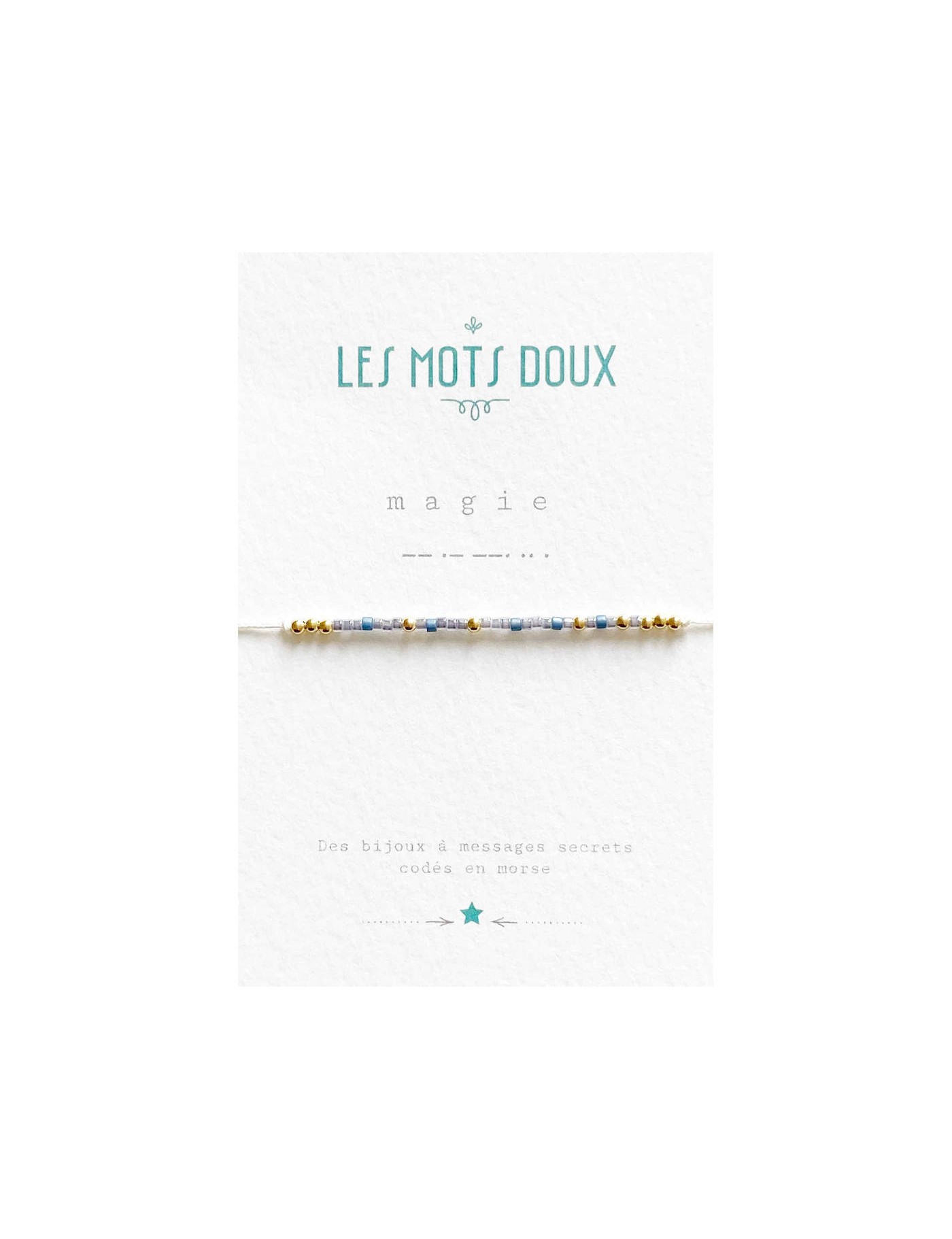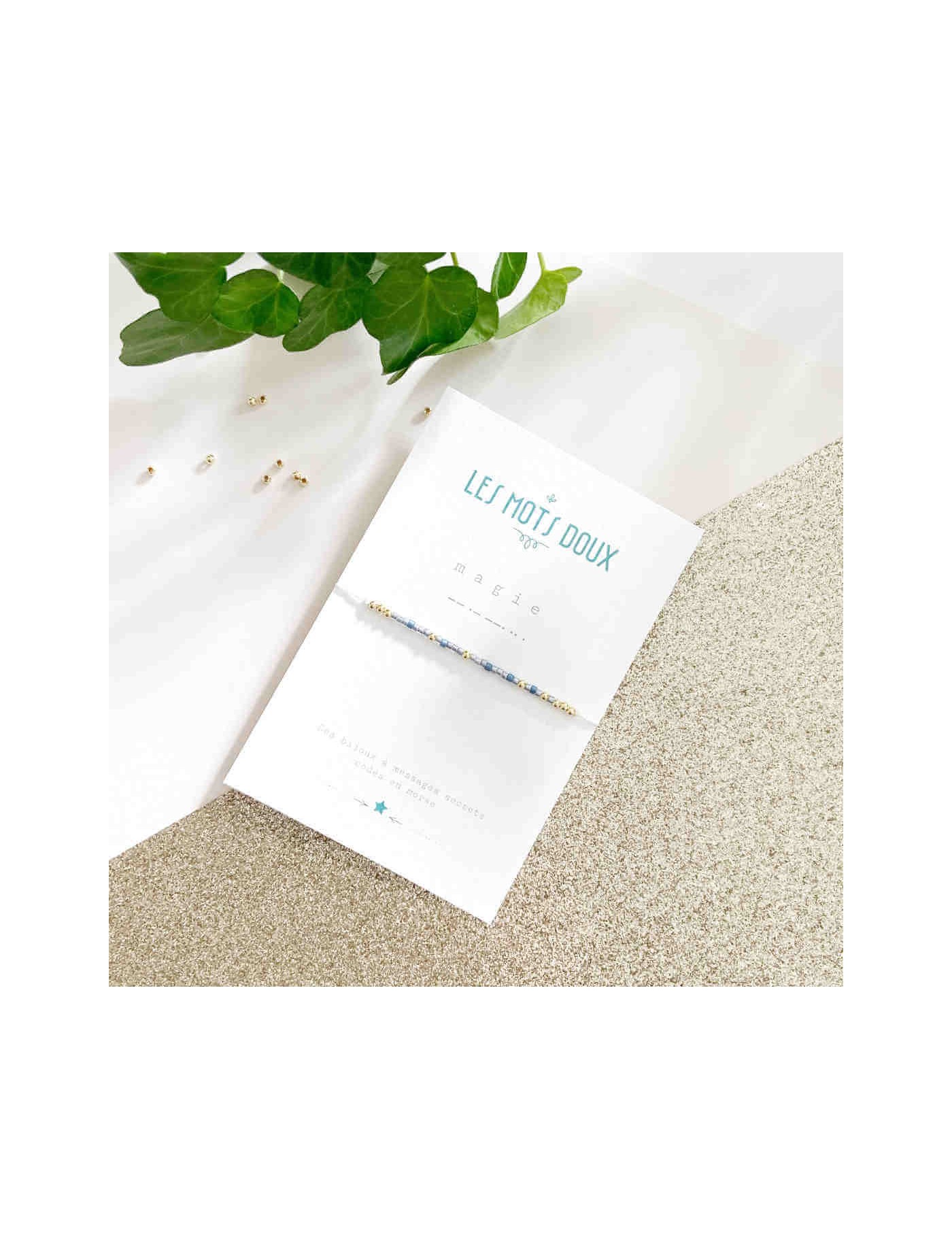 Bracelet à message secret, codé en morse. Ici, le message est MAGIE. Les perles fines reprennent le code de l'alphabet morse. Les perles sont dans les tons dorés et bleus. Le bracelet MAGIE est fabriqué à la main, en France.