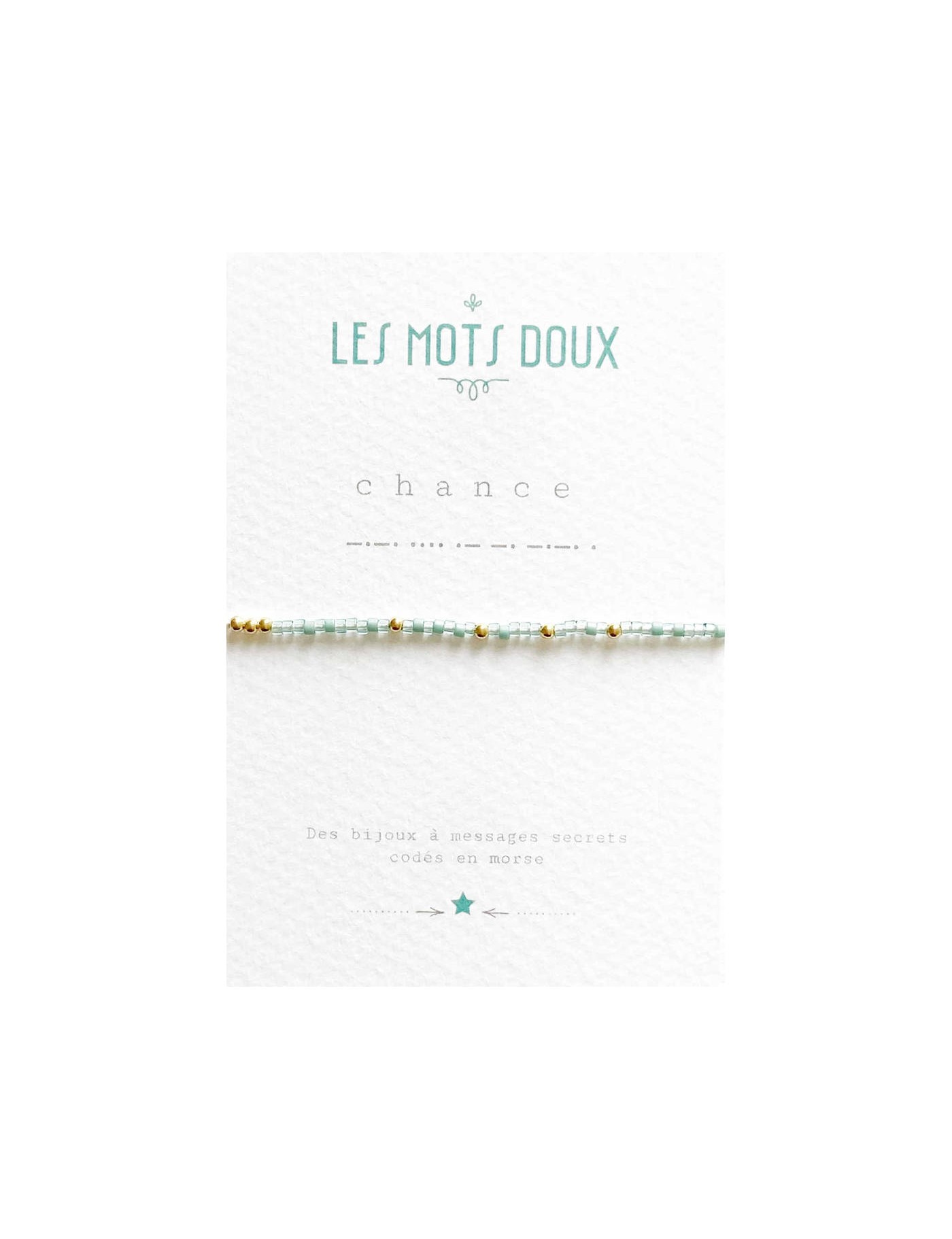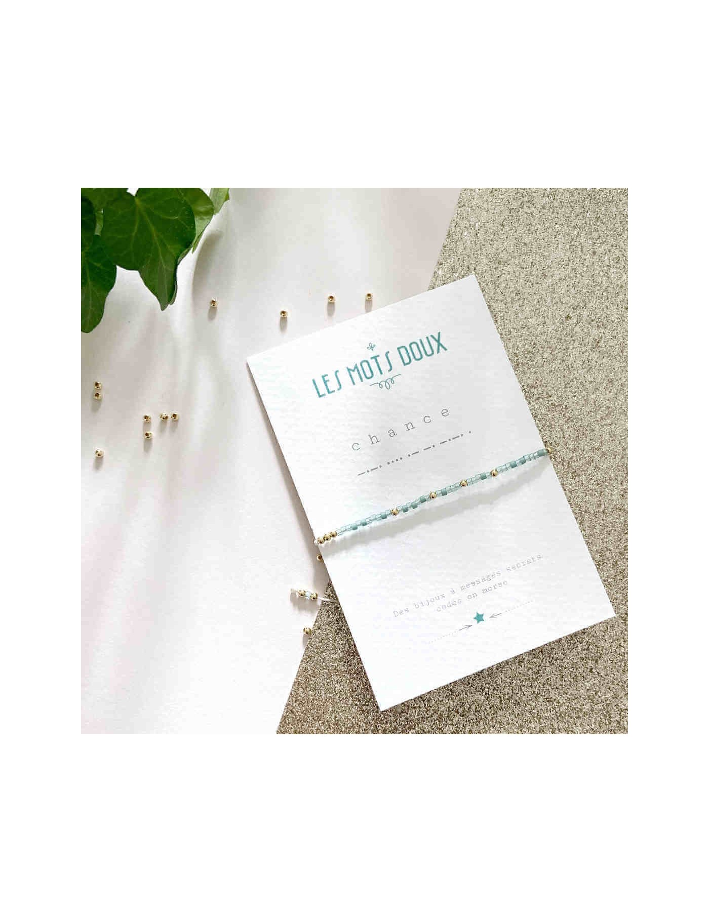 On craque pour ce bracelet à message secret, codé en morse. Ici, le message est CHANCE. Ce sont les perles qui reprennent le code de l'alphabet morse. Les perles du bracelet sont les tons bleus pâles. Ce bracelet est fabriqué à la main, en France.