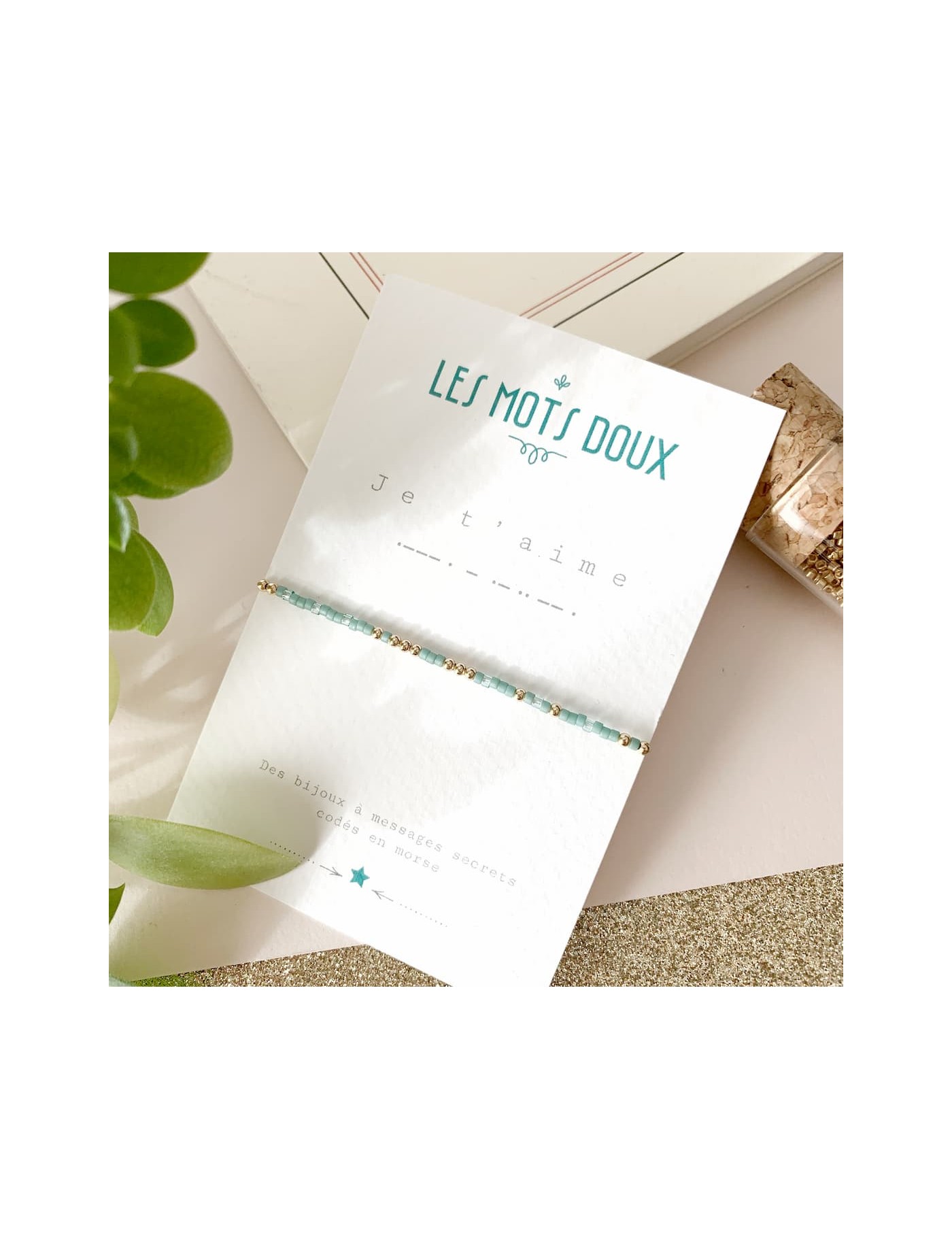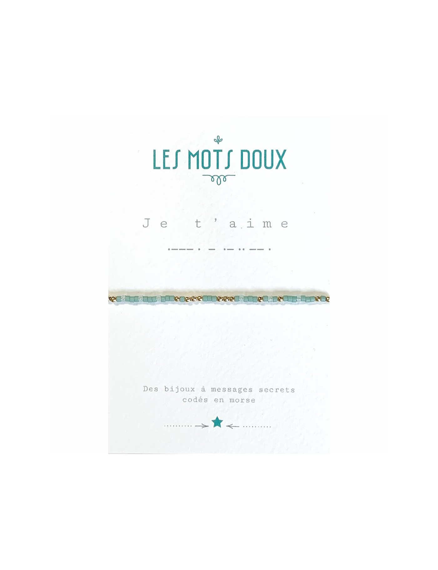 Un bracelet codé en morse pour lui dire "je t'aime". Les mots doux ont imaginé des bracelets à messages secrets, codés en morse. Ces bracelets sont fabriqués à la main, en France. Les perles fines reprennent le code de l'alphabet morse. Le bracelet est dans le ton vert d'eau.