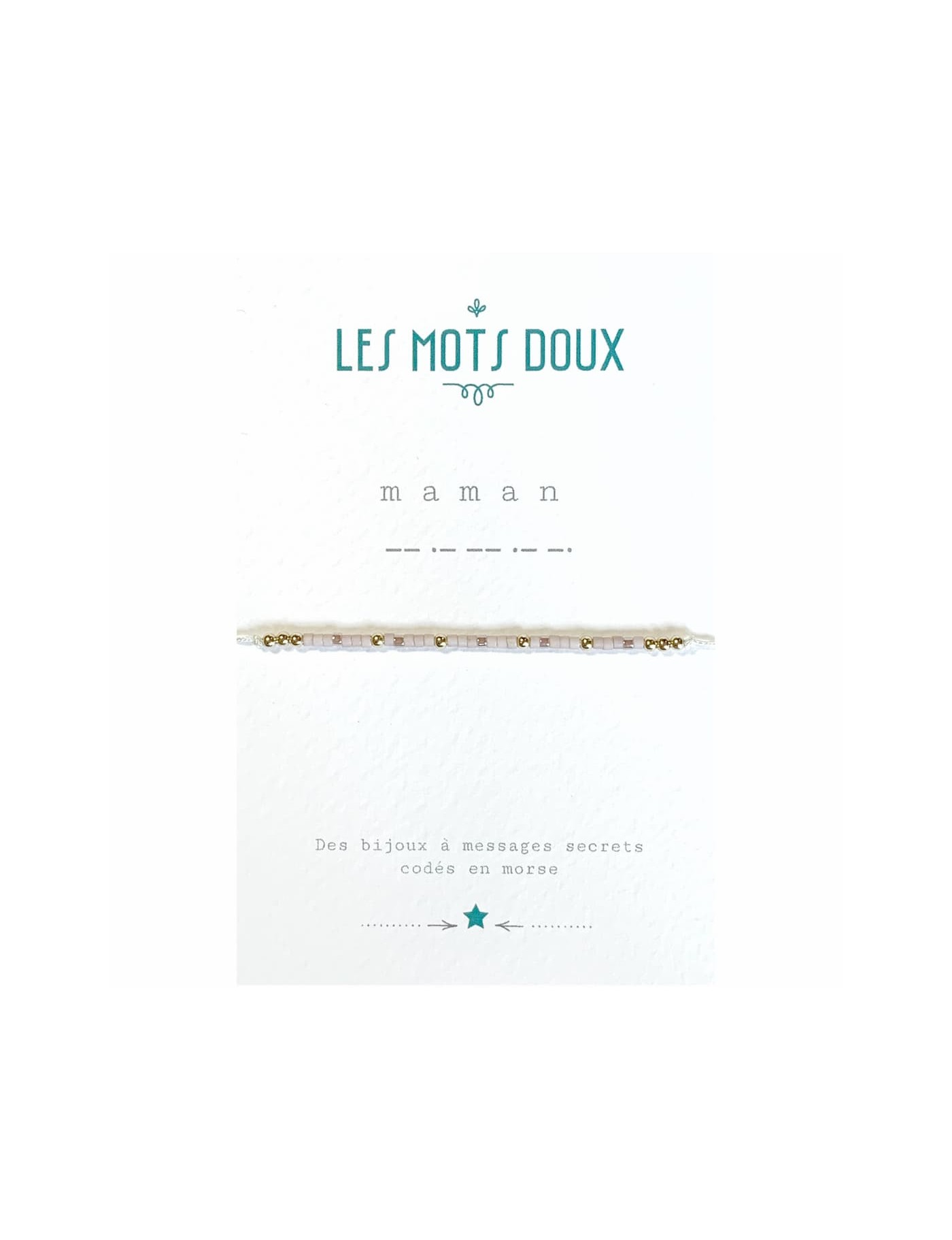 Qui n'a jamais rêvé d'un bracelet à message secret ? Les Mots Doux l'ont fait ! Des bracelets à messages secrets codés en morse. Les perles fines du Japon reprennent le code de l'alphabet morse. Ici, le message est Maman. Vous avez le choix entre deux couleurs : rose et blanc. Le bracelet codé en morse Maman est fabriqué à la main, en France.