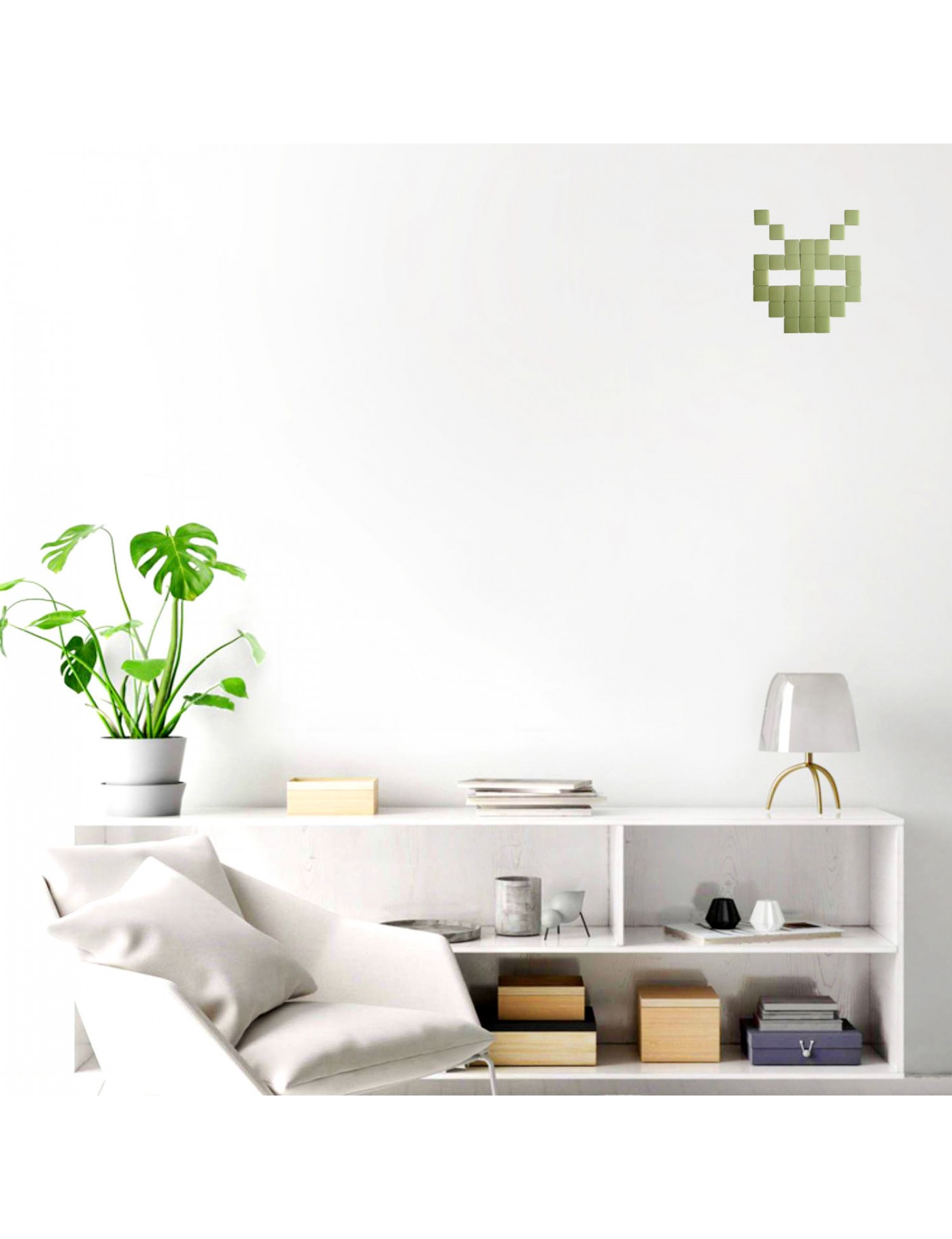 Mosaique prête à poser, composée de carreaux de verre colorés en vert et équipés d'un adhésif puissant professionnel spécial outdoor. En suivant le plan de pose, tu installeras facilement, rapidement et proprement ton propre 'invader' dans ton salon, chambre, entrée....ou sur ta terrasse, maison....ou partout ailleurs où tu le souhaites.
