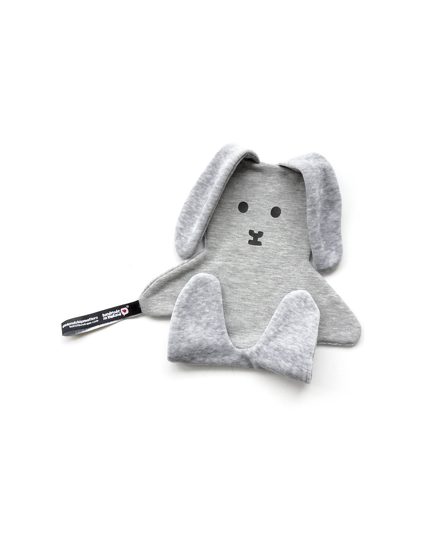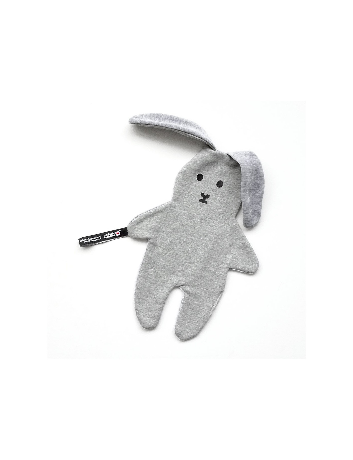 Un premier copain, c'est très important. Flap le lapin sera le premier copain de votre bébé. Qu'importe qu'il soit tapé, traîné sur le sol ou plein de bavouille, un copain reste un copain :) La grande étiquette permet d'attacher une tétine. Le doudou lapin est fabriqué à la main aux Pays-Bas. Il est lavable en machine à 30 degrés.