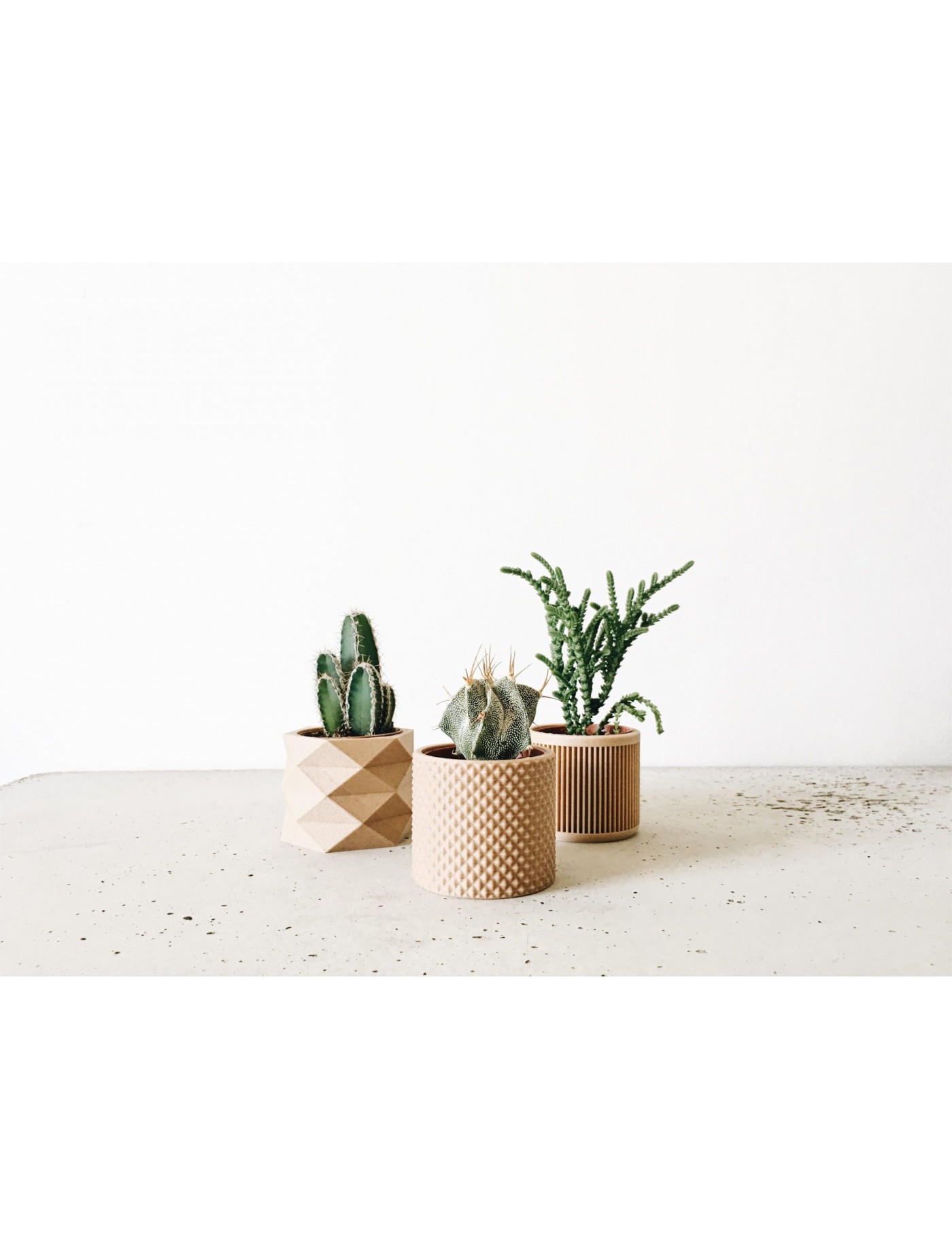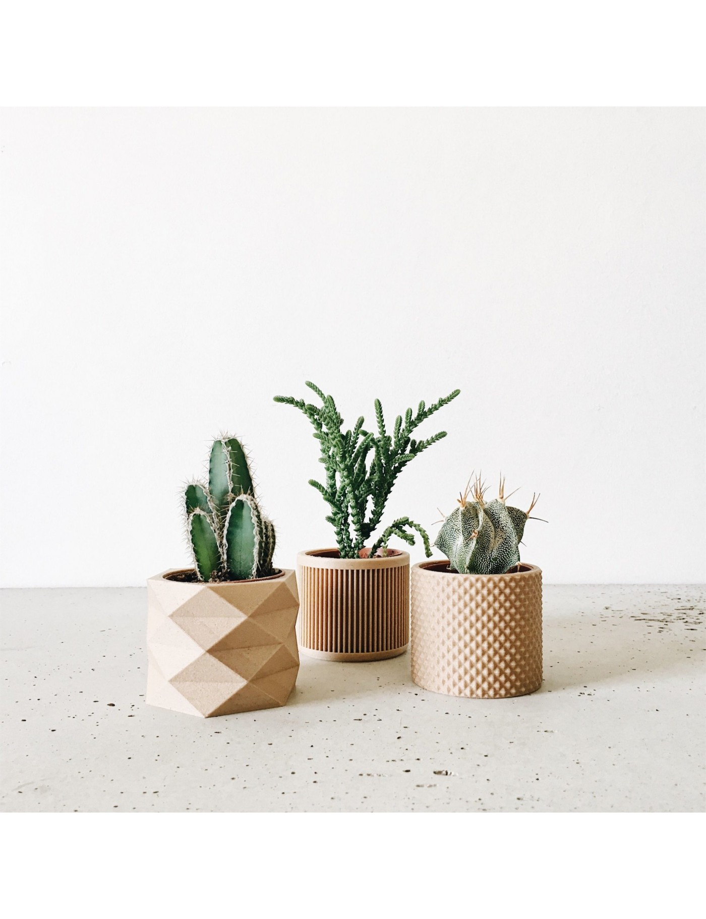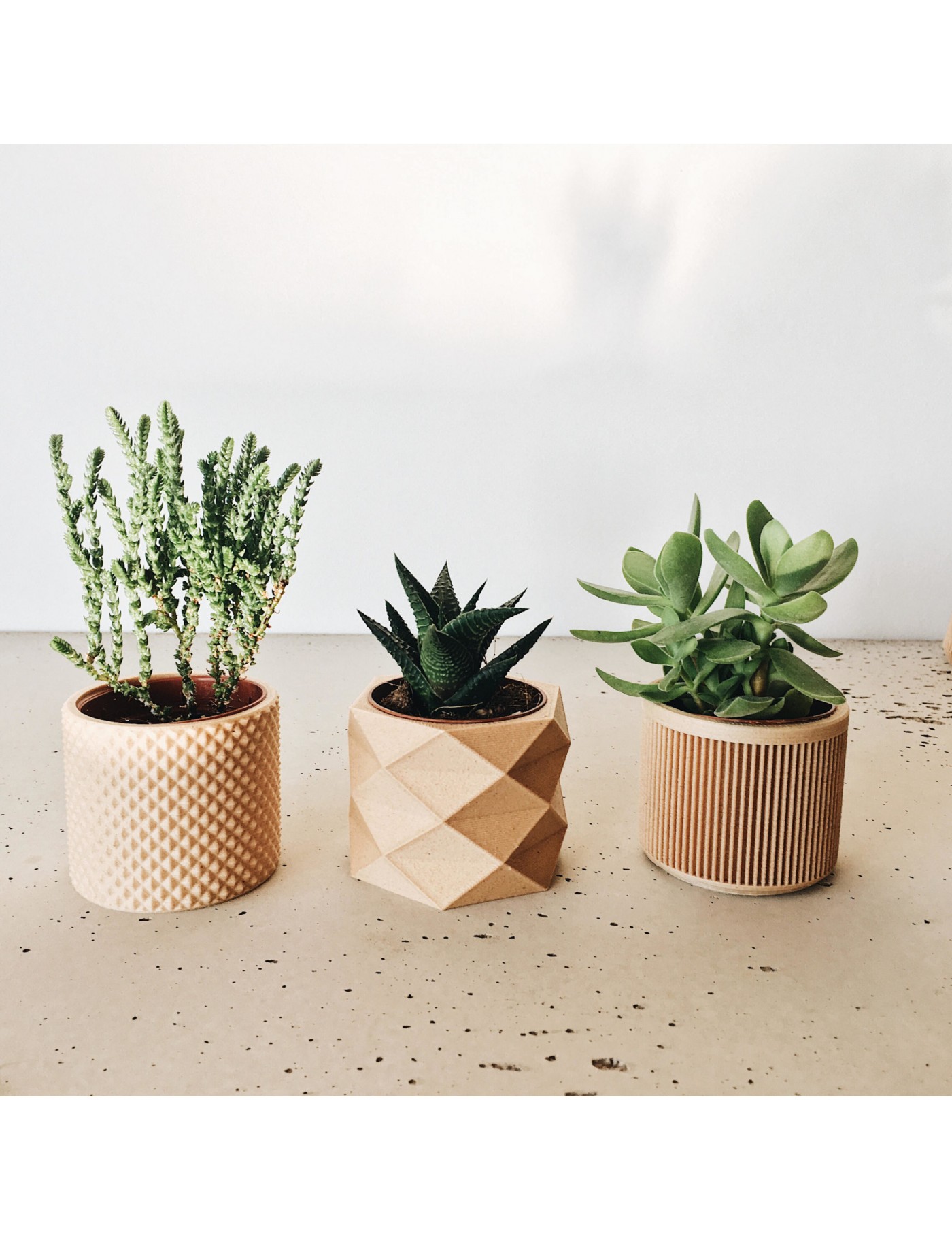 On craque pour ce set de trois caches-pots fabriqués à partir d'un mélange de bois recyclé et de bio plastique à base de maïs. Leur composition rend ces caches pots durables et totalement biodégradables. Mélisande et Philippe utilisent l'impression 3D pour créer ces jolis caches pots. On aime leur design minimaliste. Et vous ?
